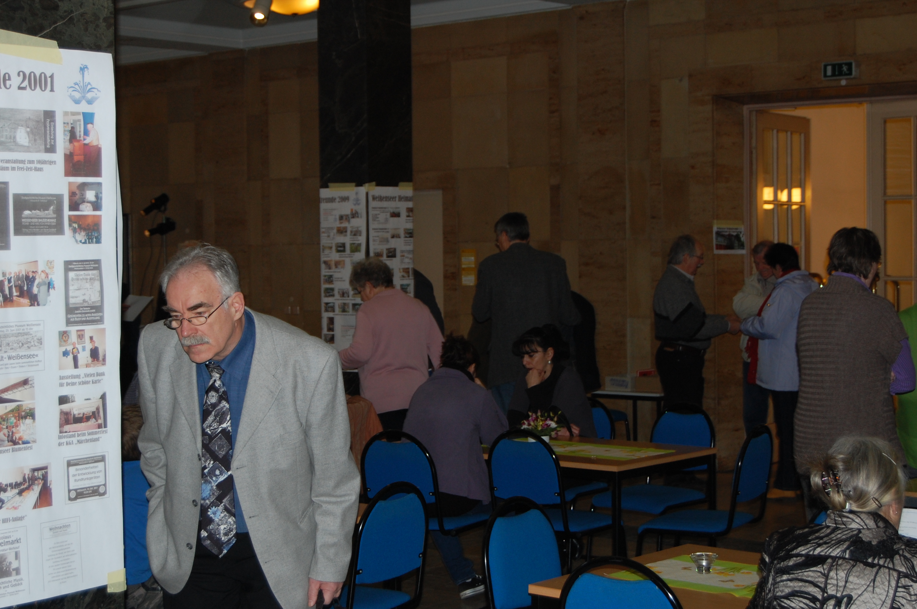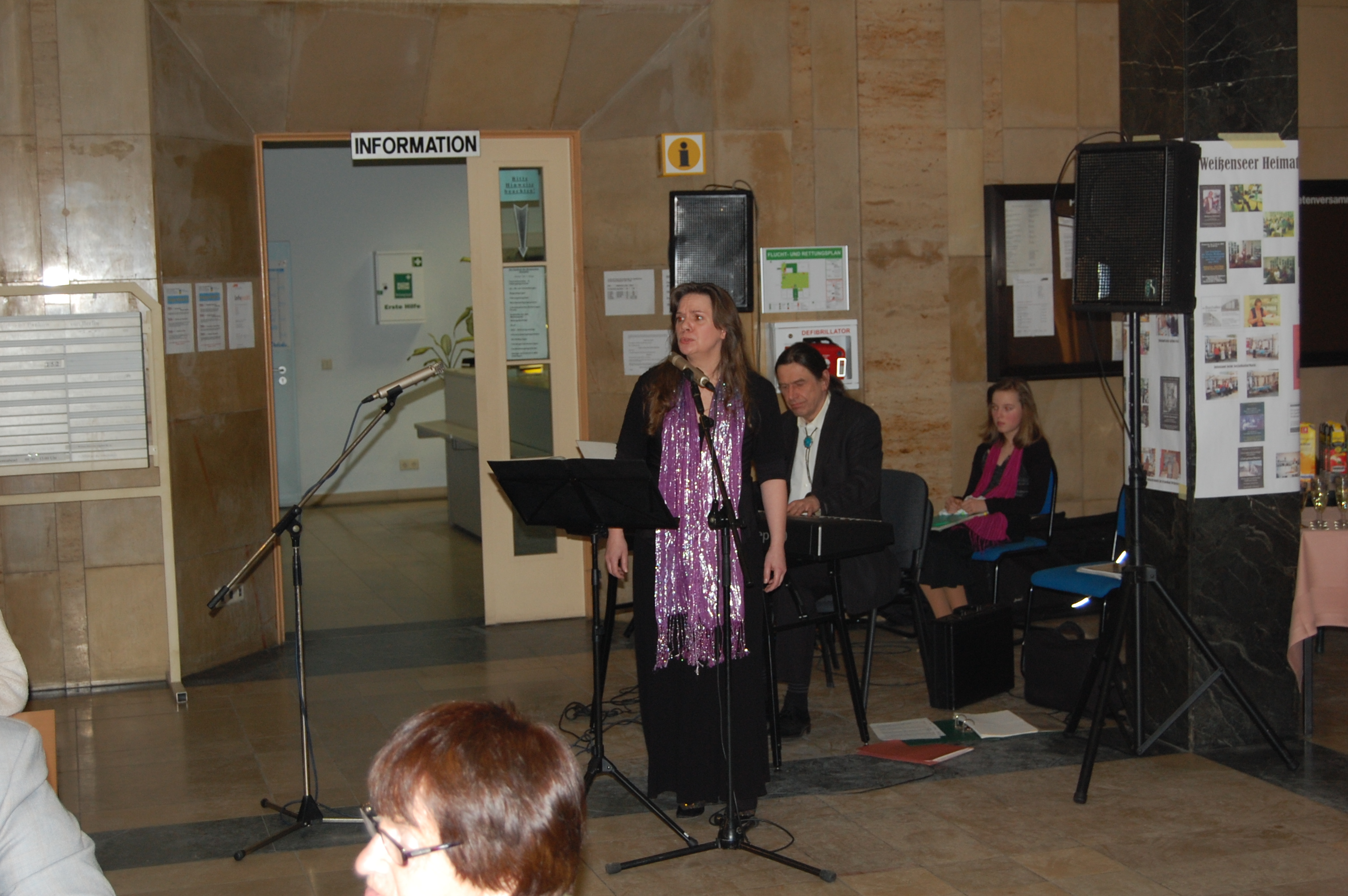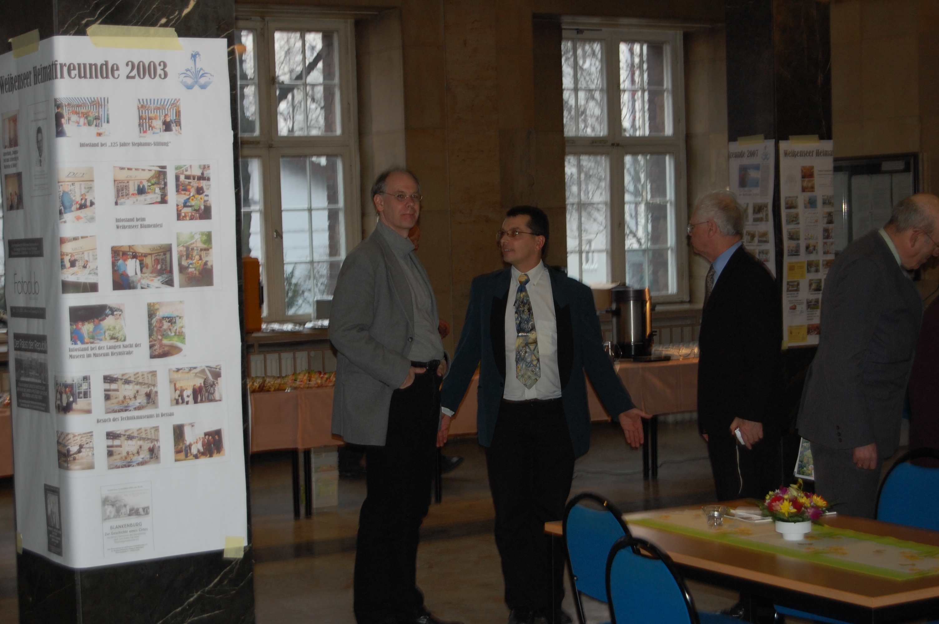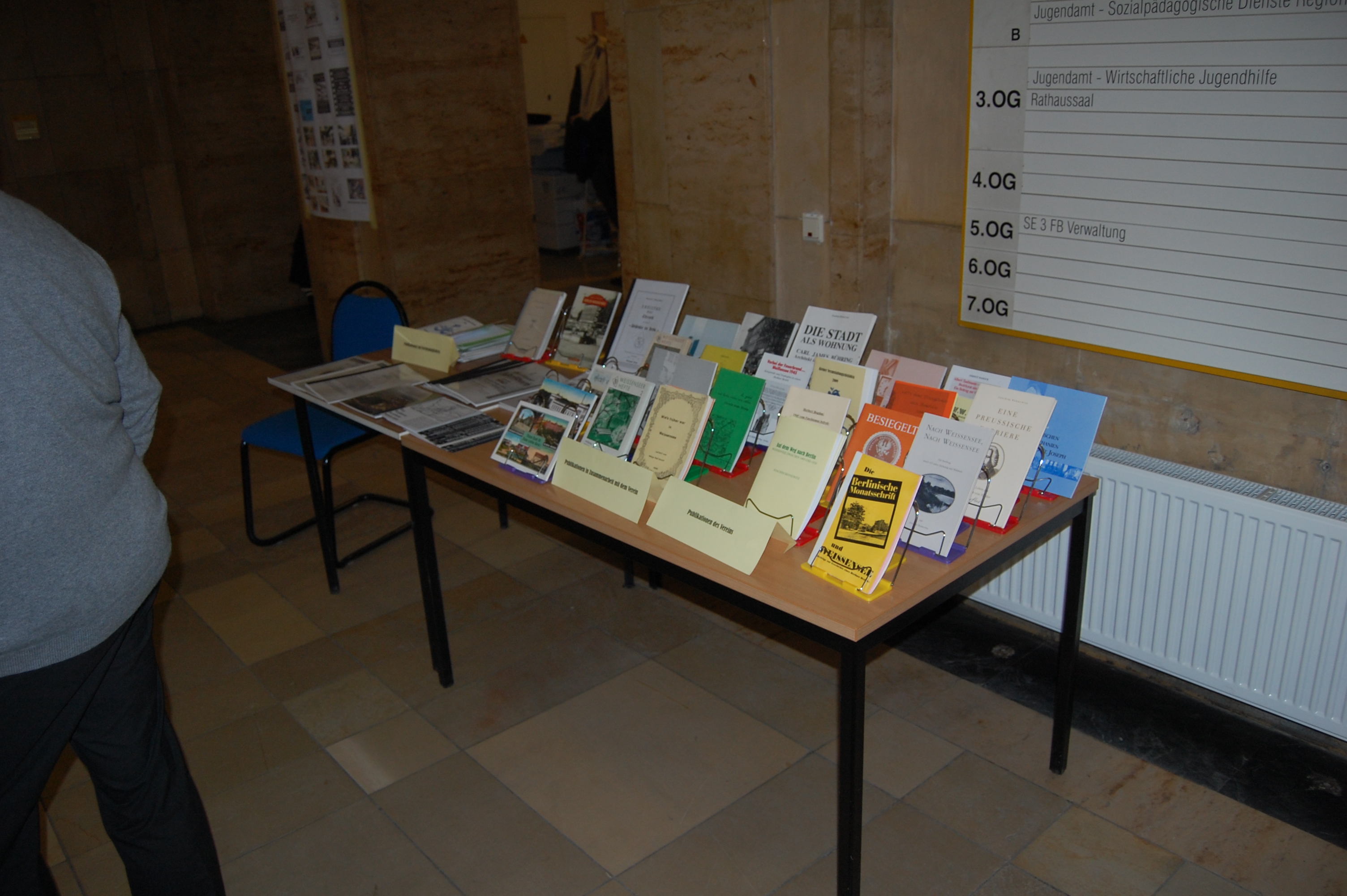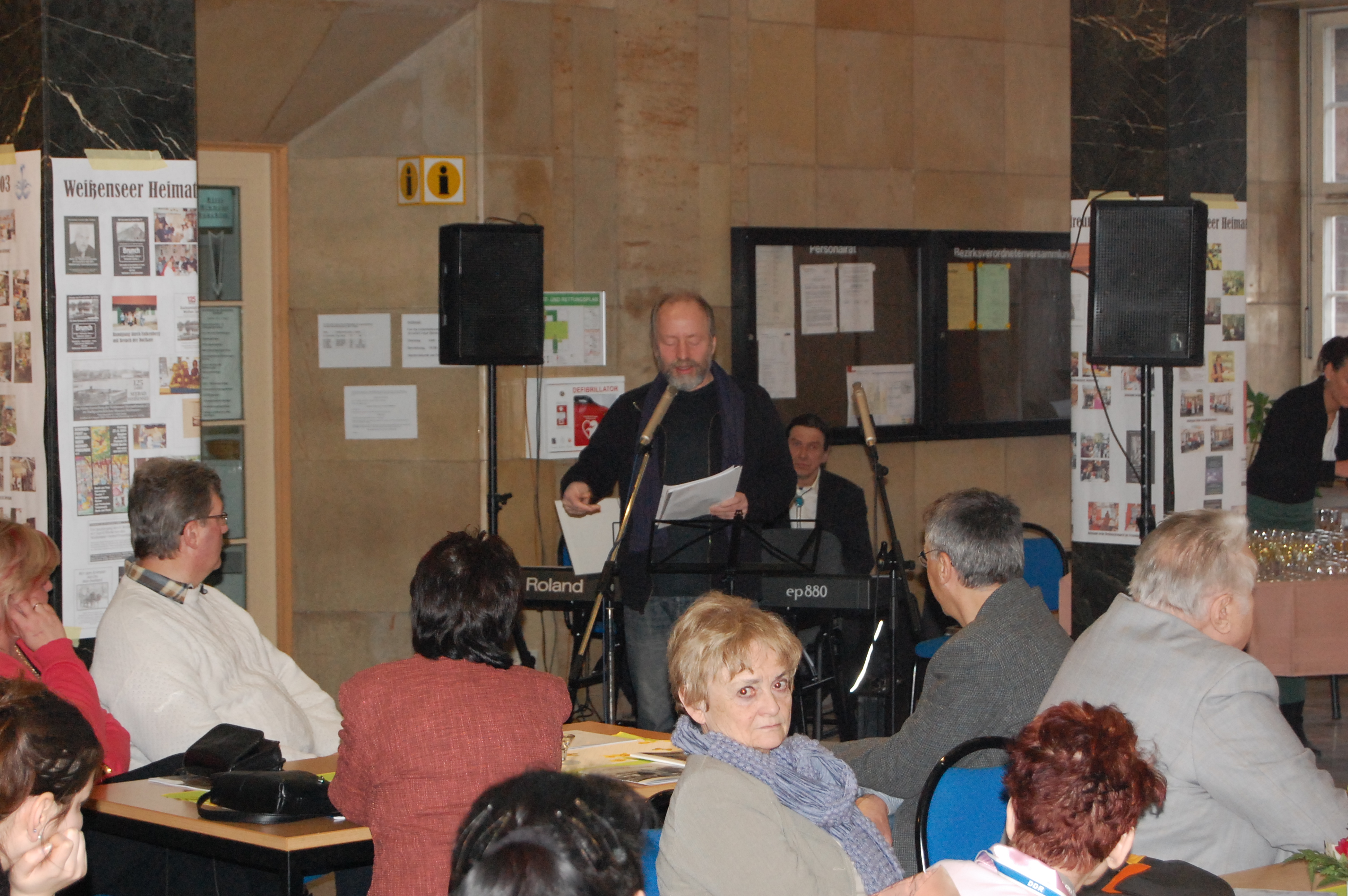 Ein kleiner Büchertisch zeigt die Ergebnisse der Forschungsarbeit des Vereins. An den Säulen war eine Ausstellung mit Veranstaltungsplakaten aus der 20jährigen Geschichte. Zusammen mit der Weißenseer Blumenkönigin stellte unser Vorsitzender Jürgen Kirschke einige Gründungsmitglieder des Verein vor. Den musikalischen Rahmen bestritt die Opernakademie Berlin. Im Obergeschoss waren Zeichnungen des Weißenseer Künstlers Edgar Ringert zu sehen.
